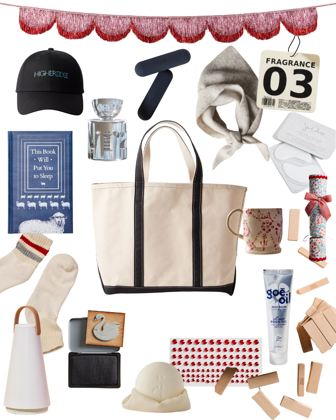 And a few more items to help you feel your best: HigherDOE Red Light Hat, The Sixth Eau de Parfum, Bala Bars, Jao Goē Oil, air freshener, and a classic Boat and Tote to throw it all in